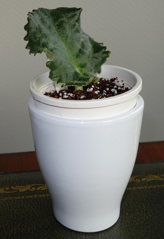 Am 13. Januar 2017 habe ich ein Blatt von meinem mit Rüschen blühenden Usambaraveilchen in Wasser gestellt. Gestern konnte ich sehen, dass sich schon 2 mm lange Wurzeln gebildet haben. Ich habe das Blatt dann sofort in Substrat eingetopft.