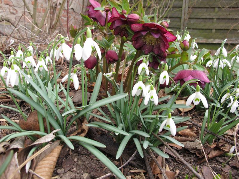 Hier ist der Schnee längst weg, Winterlinge und Schneeglöckchen fangen an zu blühen, ebenso blüht Sarcococca (ja, keine Staude, aber bloß ein Zwergstrauch).