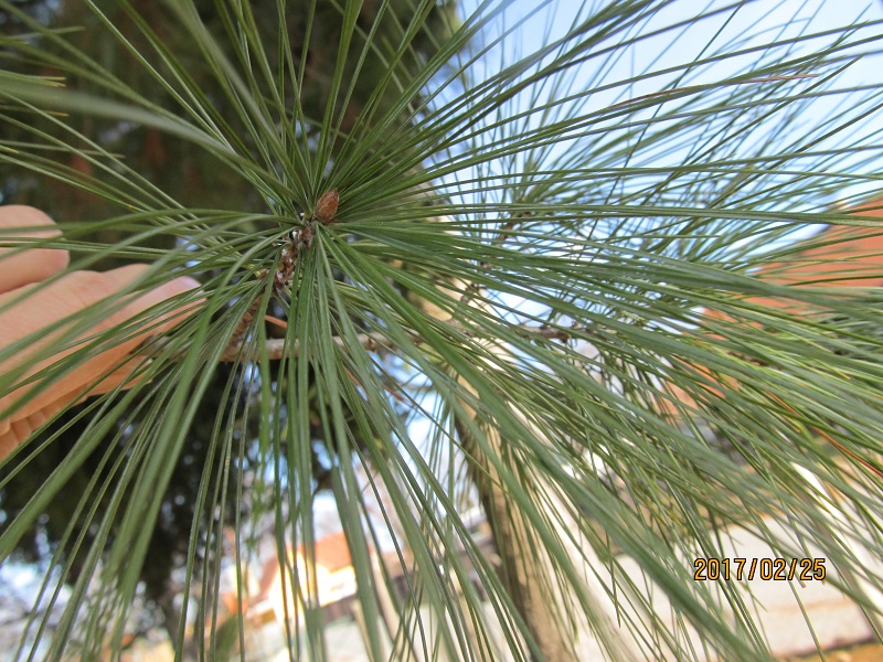 Hier nun ein Zweig mit Knospen - die Nadeln sind 9 cm lang und es sind fünf pro Büschel: