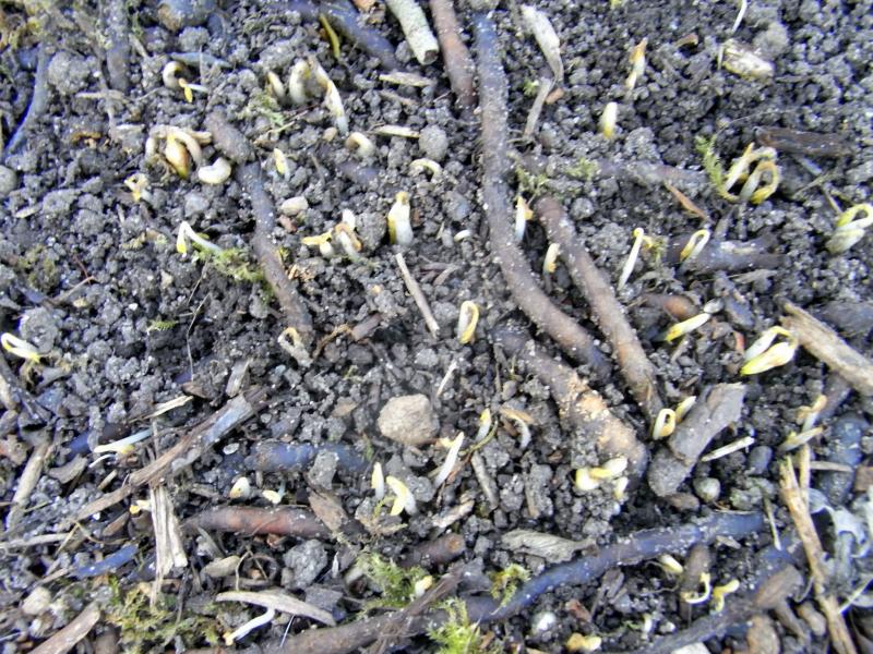 Vor ein oder zwei Jahren hatte ich in einem Anfall von Übermut eine Handvoll Eranthissamen ins große, sonnige Beet gestreut. Gestern fielen mir beim Großputz eine Anzahl kleiner grüner Halskrausen auf :).