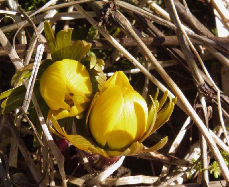 Vor ein oder zwei Jahren hatte ich in einem Anfall von Übermut eine Handvoll Eranthissamen ins große, sonnige Beet gestreut. Gestern fielen mir beim Großputz eine Anzahl kleiner grüner Halskrausen auf :).
