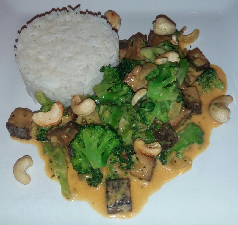 Rotes Thaicurry mit Brokkoli, Mandeltofu und gerösteten Cashewkernen