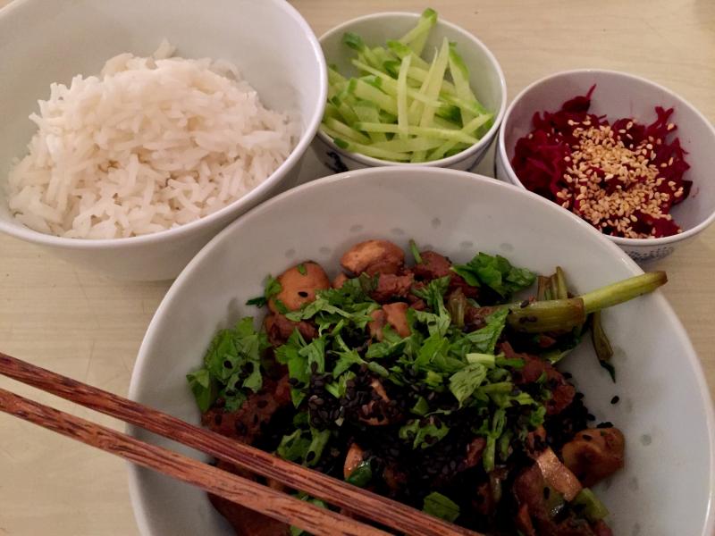 mariniertes rindfleisch, duftreis, rotkohlkimchi, grüner rettich.