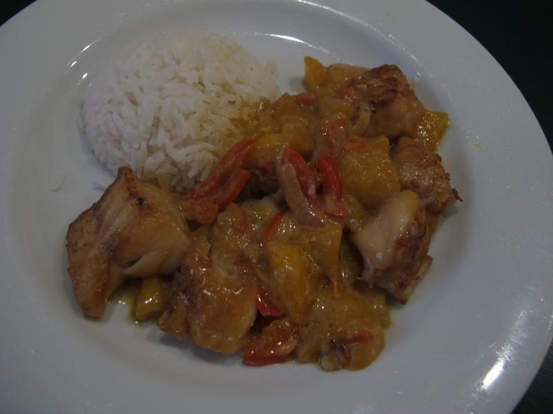 Hier gab es scharf gebratene Kabeljaustücke in einer Mangopaprikafrühlingszwiebelingwerkokosmilchsauce, Basmati. Da hätte ich mich mal an Kaffirlimettenblättern versuchen können :-\