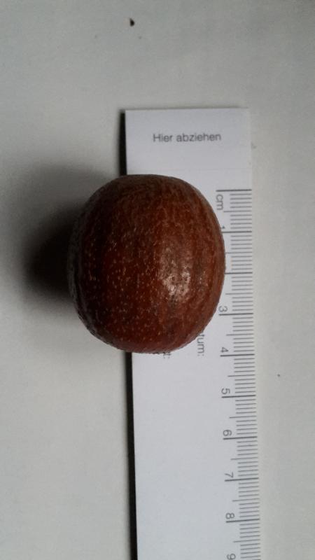 Ich habe in Zürich einen Baum gesehen( Anfang Februar) mit braunen ca 3cm großen Früchten, die noch am Baum hingen, braun, relativ hart, eine lag am Boden, und eine zertretene, dürfte einen großen Kern haben, der sich nicht vom Fruchtfleisch löst. Die Blätter dürften die ordentlichen Parkpfleger schon entfernt haben, es lagen keine mehr am Boden.