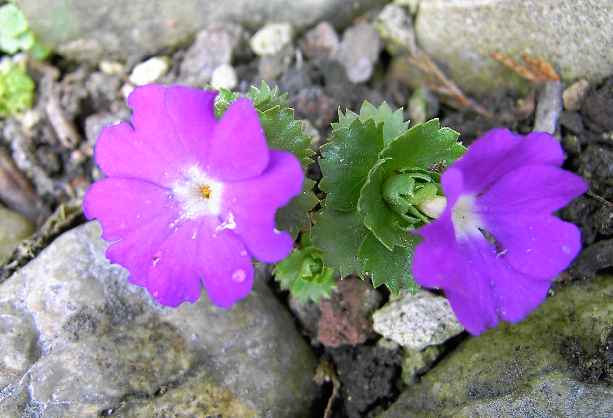 Jetzt der Naturbastard mit den gleichen Eltern. Die Pflanze heißt Primula x miniera. Eine schöne, aber auch ähnlich Pr. allionii, nässeempfindliche Pflanze.