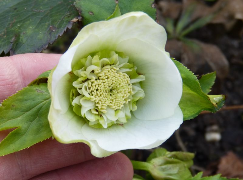 Die Mutter hat eine einfache weiße Blüte mit grünen Nektarien, die sich dann später gelb verfärben. Vater unbekannt.