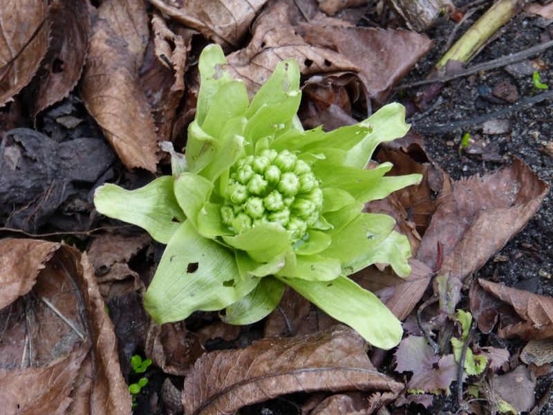 Erythronium und Trillium rühren sich noch nicht, aber die Corydalis stehen in den Startlöchern. Die brauchten von unsichtbar bis Knospenstadium gefühlte 3 Tage.