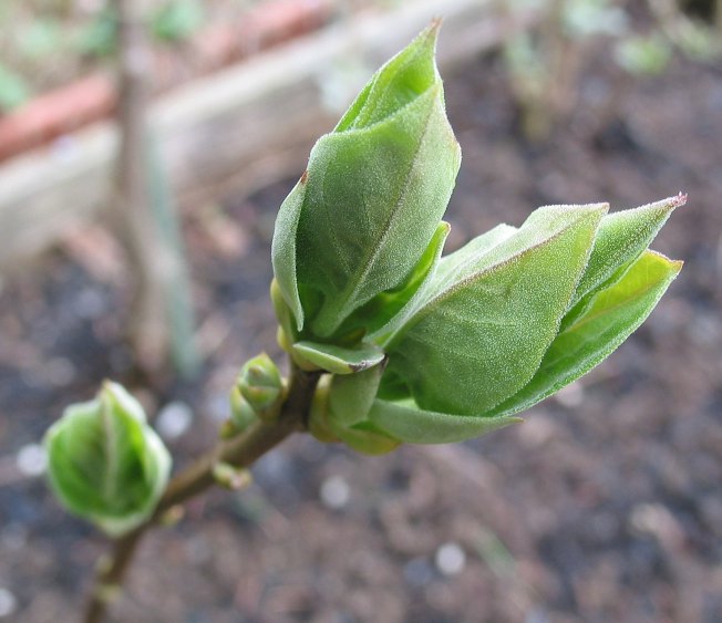 Ein Steckling des Flieders (Syringa vulgaris) vom letzten Jahr. Foto von heute.