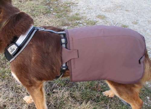 Dann habe ich krampfhaft nachgedacht, wie ich das Teil am Hund festmache. Die Lösung waren die Laschen, die oben um den Bauchgurt des Geschirrs gelegt und mit Klettbandstücken festgemacht werden.