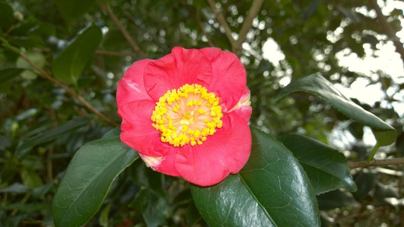 Camellia japonica Hino Maru blüht jetzt auch auf.