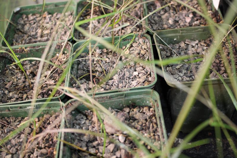Hier habe ich nochmals Anemanthele l. ausgesät, dahinter Muhlenbergia lindheimeri und rechts Sporobolus wrightii. Letztere ist etwas zickig, da sie zur Keimung über 22 Grad braucht, dann aber bei zu warmen Temperaturen schnell eingeht. Aber es werden hoffentlich genug übrigbleiben: