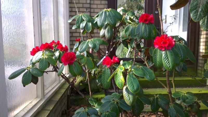 Jetzt geht es los. Die Witterung ist günstig und frostfrei. R.barbatum und R.argipeplum kurz vorm aufblühen. Gerade voll aufgeblüht Rhododendron exasperatum KW8250. Diese aus Arunchal Pradesh und in angrenzenden chinesischen und burmesischen Gebieten wachsende Spezie ist extrem früh und wird in den meisten Jahren vom Frost erwischt, aber dieses Jahr 10 Blüten. Auch sehr schönes Laub.