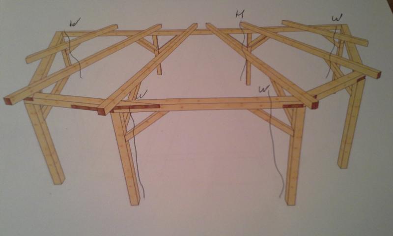 bei der Höhe werde ich die Unterkante der umlaufenden Balken circa auf 2,10m machen, somit währen die Unterkante der Sparren auf 2,25 und die Kiwis würden dann auf einer Höhe von 2,35m verlaufen.