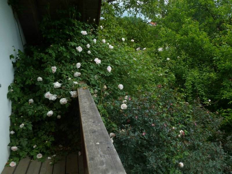 Rosa Mme. Alfred Carrière, die ihre Blütenpracht in den letzten drei milden Wintern bis über den Balkon ergossen hatte (Bild ist vom vorletzten Jahr, mittlerweile hatte sie schon den halben Balkon und die Dachbalken erobert), ist ziemlich matthellgrün. Das läßt auf nichts Gutes im Inneren der Triebe schließen.