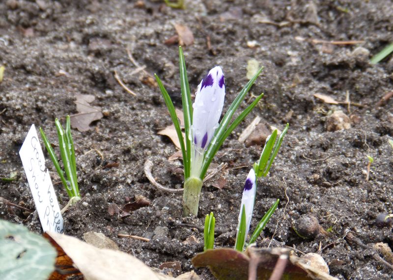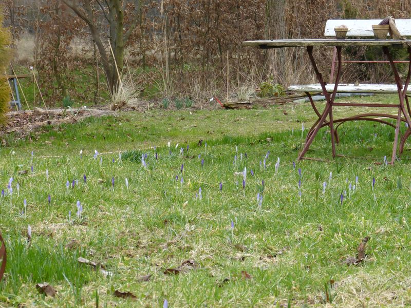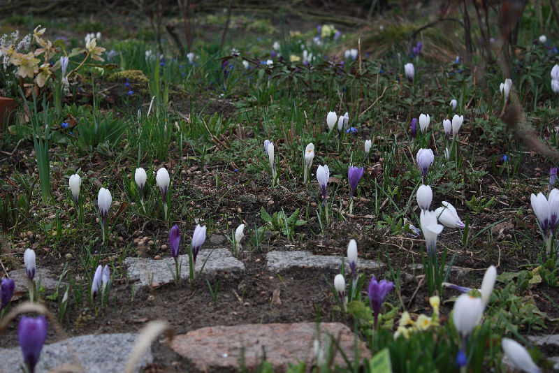 Die normalen Gartenformen von Crocus vernus (im weiteren Sinne 8)) breiten sich sparsamer aus als C. tommasinianus, scheinen aber größere Strecken zurückzulegen. Allmählich ziehen sie sich über den gesamten Garten. Ein paar waren da, als wir übernommen hatten. Zugepflanzt habe ich nie welche.