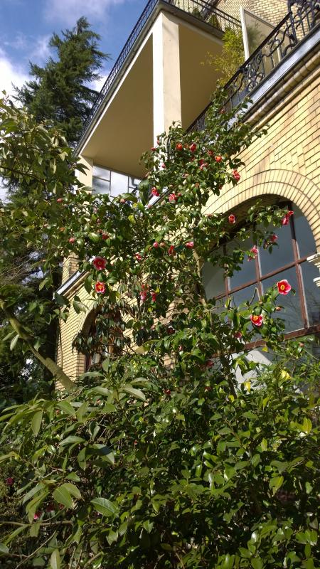 Die 3m hohe Camellia japonica Hagoromo ist nach 6 Tagen Abwesenheit voll aufgeblüht
