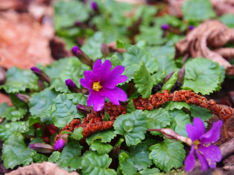 Primula juliae, danke dem Spender! Sieht sehr gut aus, das Habitat scheint zu behagen. Die Würste kommen vom Haselbusch, der über der Szene ausgebreitet ist.