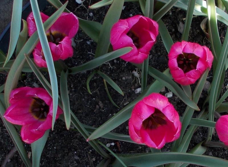 Am Sonntag hat die Sonneneinstrahlung dann doch gereicht, daß sich die schon etwas "überständigen" Tulipa humilis 'Violaceae Black Base' etwas geöffnet haben (so daß man auch die schwarze Basis sieht ;)).