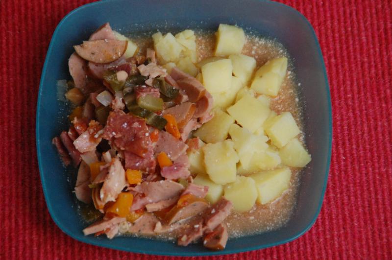 Kartoffeln mit Wurstsoljanka (diverse Wurst, Knoblauchgewürzgurken, Mangold, Zwiebel, Paprika, ganz wenig Kimchibrühe, Lorbeer, Kapern)