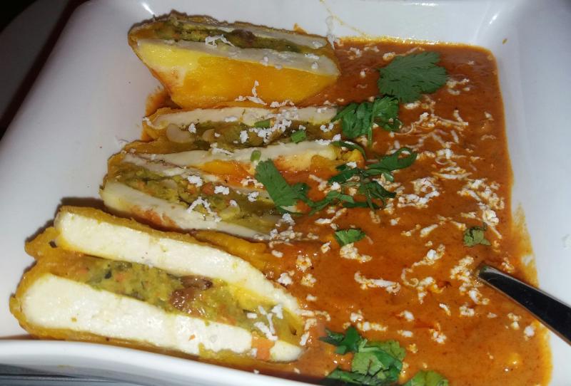 Heute waren wir beim Inder. Ich hatte mit Nüssen gefüllten Paneer in einer pikanten Zwiebelsauce.