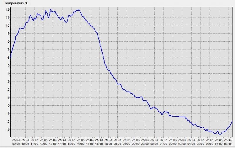 Hier gings nach dem herrlichen Wetter gestern bei klarem Himmel auch runter, aktuell -1°C.