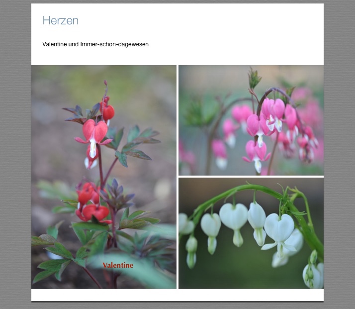 Dicentra spectabilis, das rosane war schon immer hier und muss mehr als 50 Jahre alt sein. Das Weiße sät sich gerne aus und Valentine ist erst am Samstag hier eingezogen: