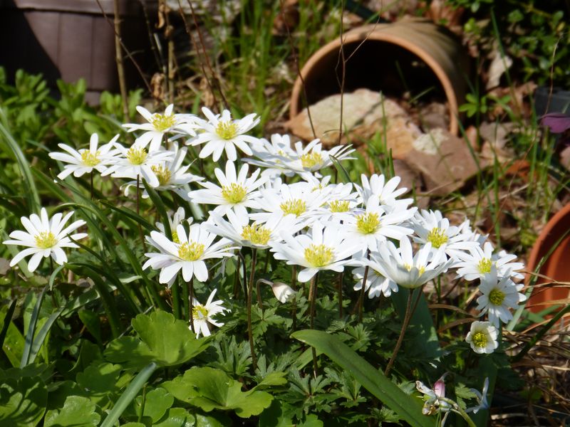 Im Herbst 2015 habe ich 25 Knöllchen von A. blanda 'White Splendor' versenkt. Letztes Jahr trieben sie schon kräftig aus. Das wurde mir zuviel in dem Beet und ich entfernte einen guten Teil wieder. Das half nicht wirklich, denen scheint es bestens zu gefallen. Das Foto ist etwas stark besonnt.
