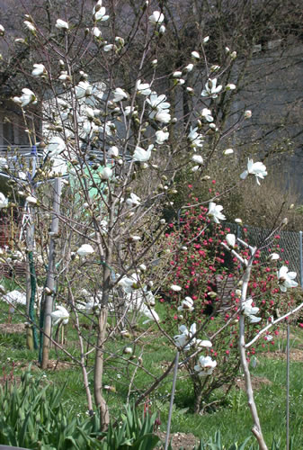 auch bei mir ist jetzt die magnolia stellata in vollblüte. sie hat brav und artig gewartet, und wird jetzt mit angenehmen blühtemperaturen belohnt.virburnum x bodn. 'dawn', abeliophyllum distichum, alle meine corylpsis, rhododendron praecox, cornus mas, cornus officinalis, lonicera x purpusii, lindera benzoin, stachyrus praecox, vib. farreri (schon ziemlich am ende der blütezeit) und viele salix stehen ebenfalls in voller blütenpracht.mit der hamamelisblüte ists jetzt vorbei, allerdings hat sie wegen der bis weit in den april anhaltenden kühlen temperaturen auch sehr lange gehalten.