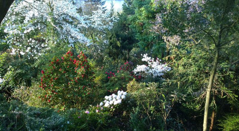 Blick von meiner Terrasse : Das Rot von Black Lace wird eingerahmt vom Weiß von Magnolia Kobus, Prunus cerasifera, Magnolia denudata und Magnolia stellata