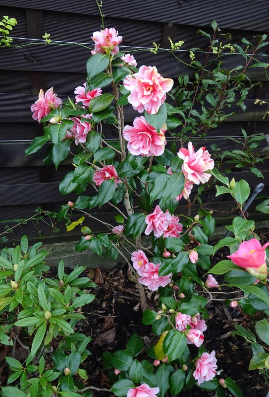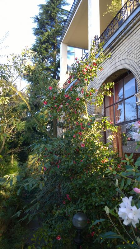Camellia japonica Tama No Ura direkt vor dem Veranda-fenster hat nach neusten Messungen eine Höhe von 5m. Blüht immer sehr lange, da die Knospen nach und nach aufgehen.