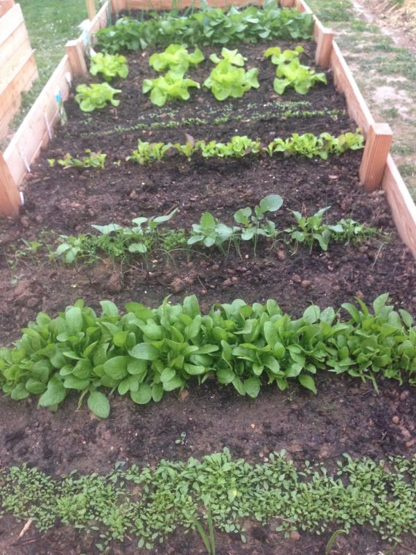 In den ersten Kasten habe ich direkt etwas gepflanzt und gesät. Im unbeheizten Gewächshaus hatte ich Salat vorgezogen, den ich nun eingepflanzt habe. Außerdem habe ich Möhren, Rote Bete, Pastinake, Spinat, Zwiebeln und Pflücksalate gesät.