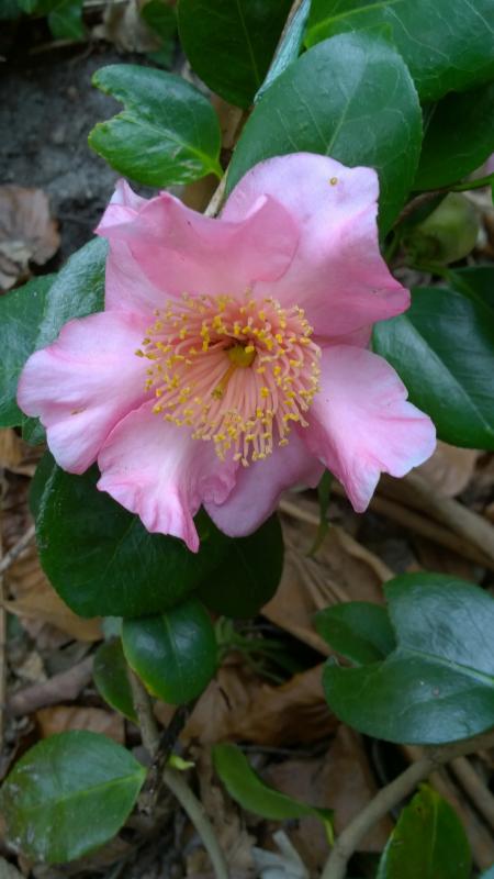 Camellia X Egao Corkscrew von Savioli. Hatte schon im milden Winter einige wenige braune Blätter. Soll frostempfindlich sein.