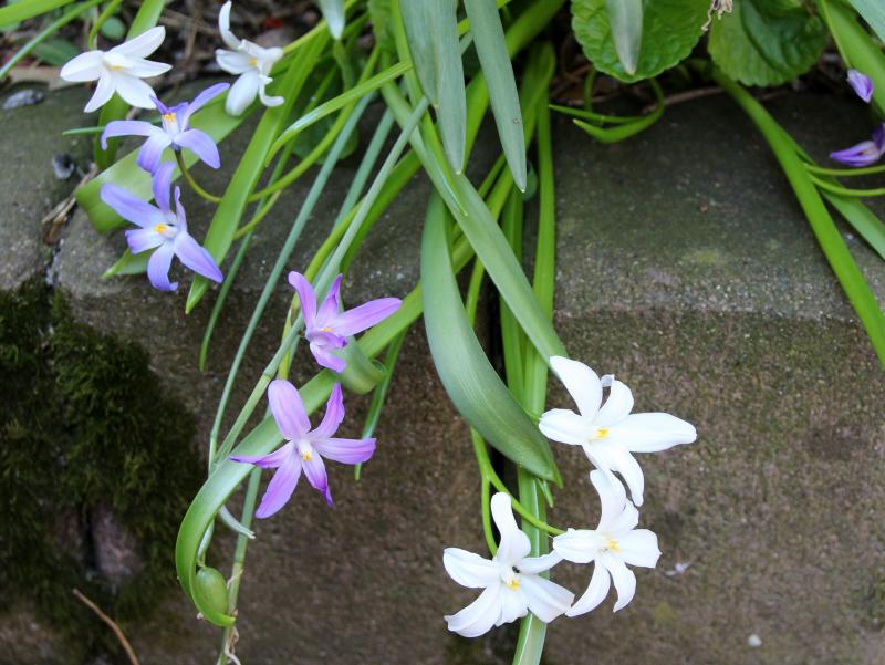 Im Herbst 1988 habe ich den weiland noch nicht vorhandenen Schneestolz hier im Garten angesiedelt; das Pflanzgut hatte ich in einer Drogerie in Annaberg-Buchholz erworben (keine Ahnung, was da für Gattungs- und Artnamen vermerkt waren ;)). Der Ausbreitungsdrang hielt sich bisher sehr in Grenzen, aber drei, vier Stellen im Garten gibt es doch, wo sich neue Tuffs etabliert haben, u.a. dieser hier. Da in der Nachbarschaft meines Wissens nirgendwo Chionodoxa in Reichweite steht, dürften das also definitiv Abkömmlinge der alten DDR-Zwiebeln sein – spätere Ansiedlungen haben hier nicht stattgefunden, von einem 2013er Versuch, 'Pink Giant' hier anzusiedeln, abgesehen, der aber gescheitert ist (wohingegen der zur gleichen Zeit gepflanzte Bestand bei meiner Mittlerweile-Ex-Freundin prima gedeiht).