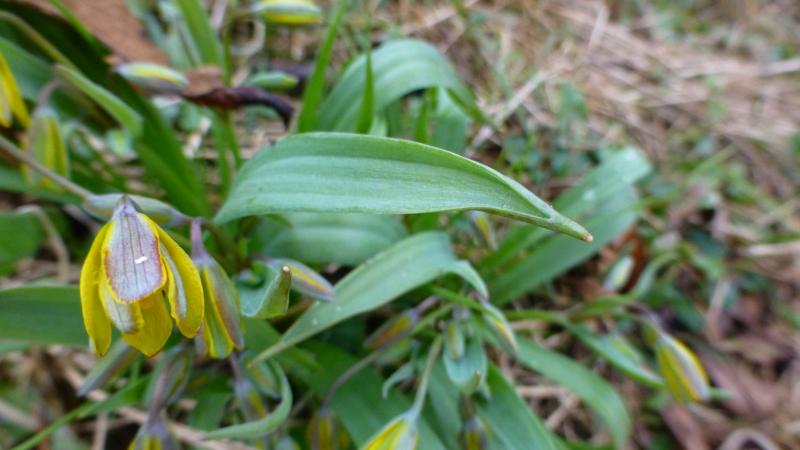Bei uns gibt es eine kleine Stelle da wächst der Kleine Gelbstern (Gagea minima). Zu erkennen das nur ein Blatt aus der Basis entspringt und es mehrere Blüten hat. Die Spitze des Blattes ist gerollt ähnlich wie bei den Stenhyazinthen.