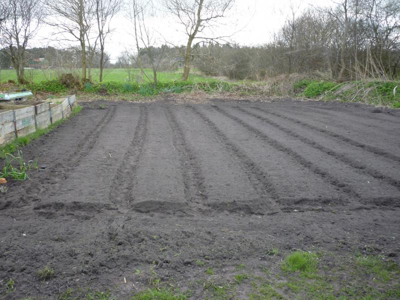 Naja, nachtrampeln tue ich auch, aber die Wege sind schon vorgegeben....durch die Fräse. Wir fräsen erst, weil viel Zeugs den ganzen Winter drauf liegt und raufgeschmissen wird und alles vertrocknete, erfrorene vom Vorjahr auf der Fläche bleibt. Dann pflügen wir und dann fräsen wir noch einmal.