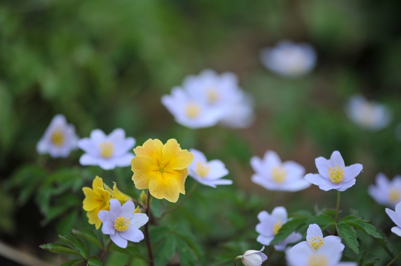 Zwischen Anemone nemorosa Robinsoniana hat sich eine Primel gesellt: