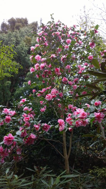Noch ein Dschungelphoto Camellia japonica Nioi Fubuki, wenn man davor steht und nach oben schaut. Der dicke Stamm ist Ilex cornuta 'Chestnut Leaf' und rechts Illicium henryi, alles wild verwachsen wie im Dschungel ;D