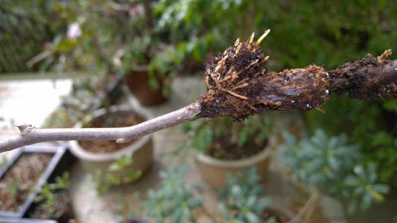 @ThorstenHH : vielen Dank für die Videos.Ich habe beide Teile heruntergeladen. Welches Hormon benutzt man in D und kann man es online bestellen? Ich hatte letztes Jahr mit einer Plastikkugel und Substrat , die mir Jost Wallis sandte, versucht Stewartia Malacodendron abzumoosen. Die hatte auch kleine Wurzeln gebildet, aber ist dann jetzt am Pilz gestorben. Diese Kugel ist ein offnens System und es ist auch schwierig die gleichmäßig feucht zu halten, da ich bei Trockenheit immer nachgießen mußte. Ich nehme an, daß man bei der Stewartia genauso vorgehen könnte. Ist es jetzt schon zu spät? Anbei ein Bild von den kümmerlichen Wurzeln die die Stewartia in 6 Monaten letztes Jahr gebildet hatte. Erstaunt war ich auch , daß der nach der Entfernung des Kambiums noch kräftig an der Rinde scharpte und ein Hormon in Puderform statt Flüssigkeit benutzte.