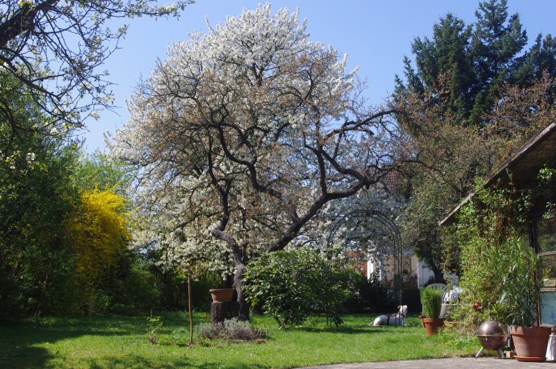 Der riesige Kirschbaum, den ich euch in seiner Blütenpracht nicht vorenthalten möchte, wäre zwar was für einen grösseren Rambler, aber da fürchte ich mich, dass so mancher alte Ast zusätzliche Last nicht tragen würde....Da fürchte ich mich auch schon so, da letztes Jahr ein riesen Ast herunter gekommen ist.... ::) Und die besagte kaputte (Sturm hat sie um ca. 3m kürzer geschlagen und kränkeln tut sie auch - kein schöner Anblick dieser Vorgarten.... :( ) Silbertanne wäre der Baum für die "Natur-Obelisken-Lösung".