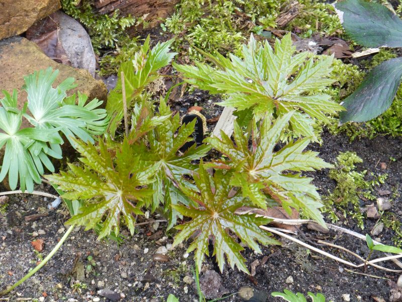 Ich habe es mit Peltoboykinia schon oft versucht, stets blieben sie mickrig und wuchsen rückwärts. Im letzten Jahr dann nochmal ein neuer Anlauf in einer kühlen Ecke, in der der Boden durchaus mal etwas feuchter bleibt. Siehe da - der Austrieb ist vielversprechend.