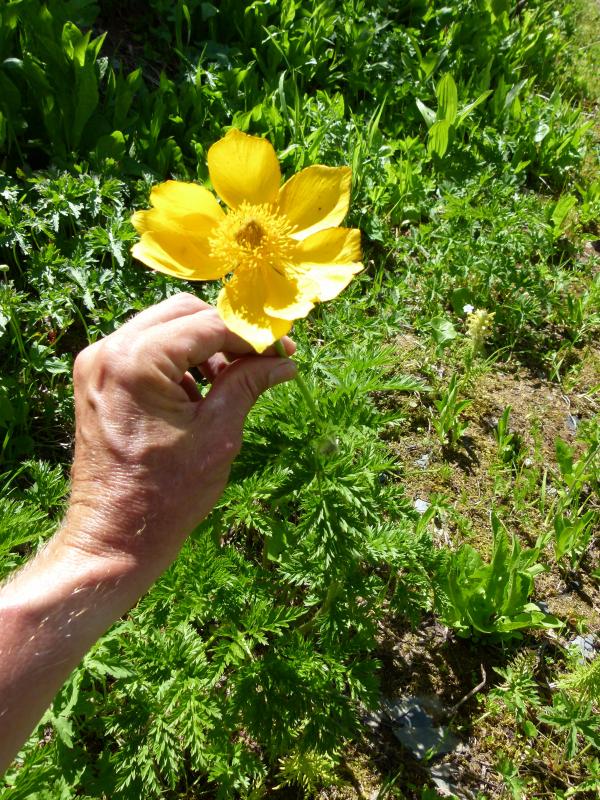 Ich kann noch ein Foto von Pulsatilla aurea vom Naturstandort, im westlichen Kaukasus, auf ca. 2500 m Höhe beisteuern. Um zu zeigen, wie großblütig die Pflanze ist, die Hand als Größenvergleich.