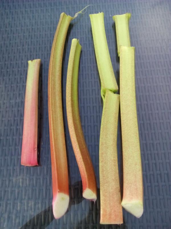 Valentine ist von oben bis unten komplett grün, ich habe eine rohe Kostprobe gemacht und festgestellt, daß er nicht so sauer schmeckt wie mein alter 08/15 Rhabarber, ja geradezu mild.