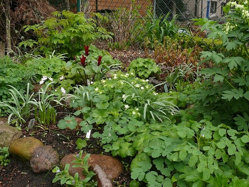 Und mein geliebtes Hepatica-Hügelchen mit Trillium sessile als Königin, die es dieses Jahr auf 4 Blüten gebracht hat. Jedes Jahr eine mehr :). Links davon die zarte Anemonella thalictroides, derweil macht sich Anemone nemorosa 'Alba plena' ganz schön dick. Ganz oben sitzen noch zwei Jeffersonia dubia (hier nicht zu sehen), wovon eine immer etwas später als die andere erscheint und blüht.