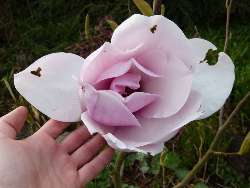 Hier gab es bisher noch keinen Nachtfrost , aber zwei Tage heftige Schneefälle, die z.B. alle Narzissen zu Boden drückten. Sowohl die noch geschlossenen wie die offenen Blüten meiner gerade blühenden Magnolien ('Burgundy', 'Pinkie' und 'Butterflies') zeigen keinerlei Schäden, etwa durch Braunwerden. Mal schauen, wie sie morgen aussehen...