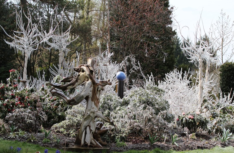 Am Morgen nach dem Beregnen sieht das dann z.B. (2012) so aus: (ein Rhododendron war unter der Last des Eises zusammengebrochen)