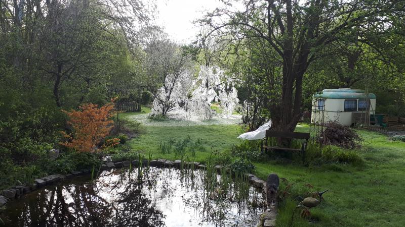 Es hat glücklicherweise nur leicht in die beiden Foliengewächshäuser reingefroren, die in einem Gartenhäuschen deponierte Wäsche, die ich heute aufhängen wollte, ist zu einem Eisklumpen verfroren und muss erstmal auftauen ;)