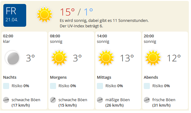 Hier laufen die Vorhersagen auch auseinander. Die einen bleiben bei dem seit Tagen vorhergesagten Nachtfrost von -2 °C (letzte Nacht waren -3 °C angekündigt).
