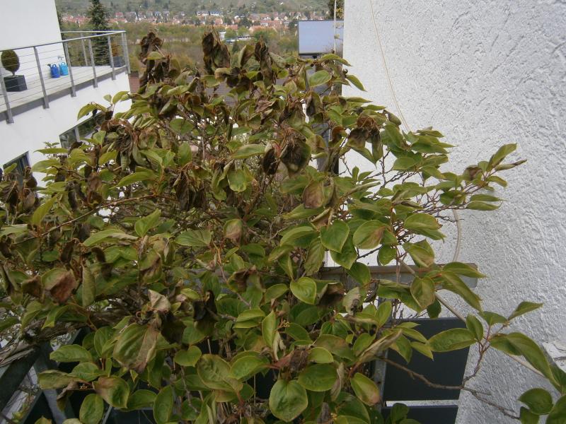 Eine kalte Nacht hat gereicht, man sieht die Schutzwirkung der Hauswand, ca 40cm reicht sie, um die oberen Triebe und Blüten der Minikiwi zu schädigen.