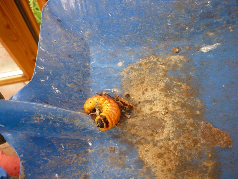 Ich wusste bisher nicht mal, dass sich in unserem Kompost Nashornkäferengerlinge befanden, bis ich sie beim Umsetzen fand. Sie waren ca. 7-8 cm lang (geschätzt) und ich musste sie vorsichtig herausholen, damit sie nicht Schaden erleiden. Irgendwie musste ich ja an die Komposterde kommen (hatte ich schon mal in einem der Kompost-Threads geschrieben). Sie brauchen sicher noch ein Jahr, bis sie zu Käfern werden. Fertige Käfer habe ich beim Umsetzen nicht gefunden, aber eine leere Hülle.